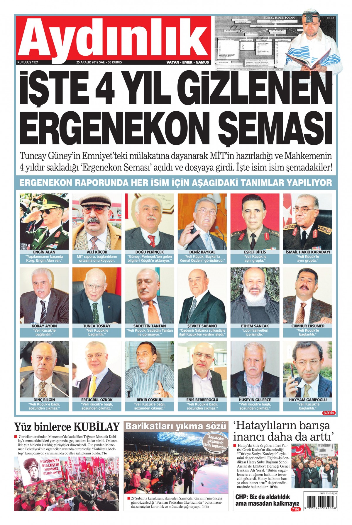 Aydınlık gazetesi, Tuncay Güney'in ifadeleriyle MİT tarafından hazırlandığı iddia edilen Ergenekon şemasını yayınladı. Gazetenin manşetinde yer alan listede Deniz Baykal'dan Hüseyin Gülerce'ye kadar 18 isim yer aldı. Bir numaranın MHP'nin tutuklu milletvekili Engin Alan olarak gösterildiği listede, Ertuğrul Özkök, Ethem Sancak, Koray Aydın da yer alıyor.