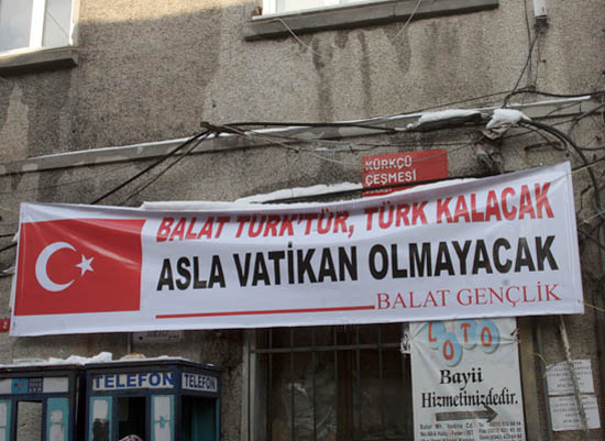 İstanbul Fener’deki Ekümenik Patrikhane’nin yakınına nefret söylemi içeren bir pankart asıldı. ‘Balat Gençlik’ imzası taşıyan pankartta, “Balat Türk’tür Türk kalacak, asla Vatikan olmayacak” ifadeleri yer alıyor. Irkçı bir Facebook sayfasında, pankartın ‘haç çıkarma törenini protesto etmek amacıyla asıldığı dile getirilerek, “Haç atma töreni ile Yunan çocuklarının İstanbul üzerindeki hayallerini diri tutmaları hayalden öteye gidemeyecektir” dendi.