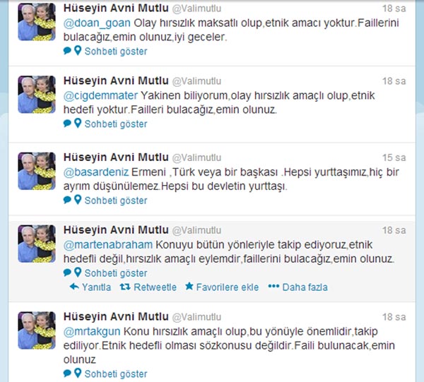 İstanbul Valisi Hüseyin Avni Mutlu, Samatya’da meydana gelen olaylarla ilgili sosyal medyada kendisine yöneltilen sorulara cevap verdi. Mutlu Twitter hesabında yaşanan olaylarla yakından ilgilendiğini belirterek “olaylar hırsızlık maksatlıdır. Etnik bir amacı yoktur. Failleri bulacağız emin olunuz” ifadelerini kullandı. Mutlu’nun twitleri şöyle;
