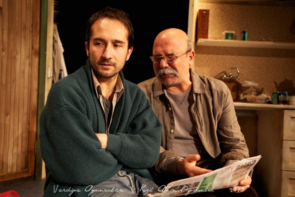 AG: Tabii ki heyecanlanırsın, her oyunda heyecanlanırım ben. Dozunda tutulursa kişinin oyuna daha fazla girmesini sağlayan bir heyecandır. Prömiyerde şöyle bir şey dedik: ne işimiz var burda, niye kalkıştık bu işe? Ben bunu 30 küsür yıldır söylüyorum. Ne işim var burada siyasalda okumuşum, gidip Vali ol, vs ol dediğim çok oldu benim. Bir de prömiyerde üzerimizde yeni bir tiyatronun, Vardiya Oyuncuları’nın ekstra heyecanı da vardı. Cihan’a da söyledim, yeni kurulan bir tiyatronun ilk repliğini sen söylüyorsun. Benim adıma heyecan verici başka bir şey de aslında ben 6 yıldır sahneye çıkmıyordum. En son 2007’nin baharında Ankara’da sahneye çıkmıştım. Çok mutluyum tekrar sahneye döndüğüme.