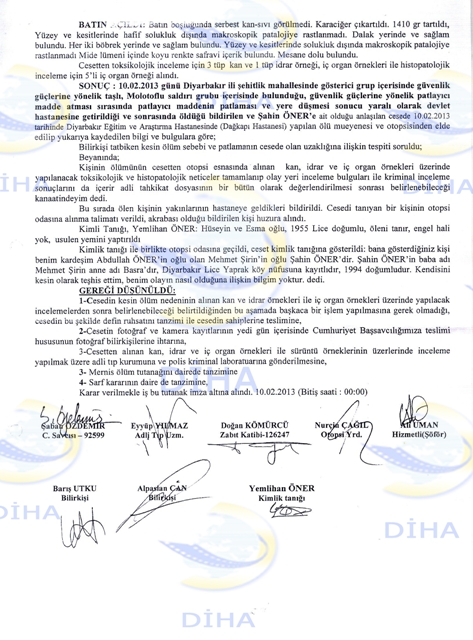 Raporun sonuç bölümünde bilirkişilerin Öner’den alınan kan, idrar ve iç organ örnekleri üzerine yapılacak toksikolojik ve histopatolojik neticeler sonucunda belirlenebileceği kaydedildi.