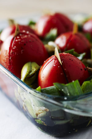 Bulabildiğiniz en kırmızı en lezzetli orta boy domateslerden on iki tane alınır. Sonra bunların tepeleri artı şekli alacak şekilde hafiften derinlemesine kesilir. Tercihen pişmiş toprak veya cam bir tepsinin dibine bolca ucuz balzamik dökülür ve kıyılmış sarmısaklar atılır. Bu sosun üzerine on iki domates birbirine değecek ama çok da samimi olmayacak şekilde dizilir. Tepelerindeki artı şeklindeki kesiklere defneyaprakları sokulur. Ayrı bir kesme tahtası üzerine tercihiniz kadar pırasa konur. Üzerine bolca tuz ve karabiber serptikten sonra bir oklava yardımıyla ezilir. Böylece pırasanın lezzetinin iyice yemeğe geçmesi sağlanır. Ezilmiş pırasaları domateslerin üzerine serpiştirdikten sonra, son bir kez balzamik gezdirilir tepsinin üstünde ve daha önceden 170 derece ısıtılmış fırında bir saat kadar pişirilir. Servis yapılmadan önce defneyaprakları çıkartılır.