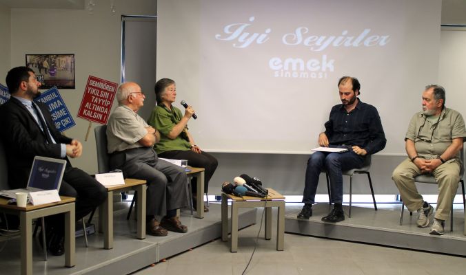 ‘Sermaye Elini İstanbul’dan Çek!’, ‘Beyoğlu Avanta Kokuyor!’, ‘Olmayan Değil, Olanı Koru!’, ‘Belleğime Dokunma!’, ‘Kent Yağmasına Son!’ gibi pankartların yer aldığı Mimarlar Odası salonunda, bugün yapılan panelde, Prof. Cevat Erden, avukat Can Atalay, Mimarlar Odası’ndan Mücella Yapıcı, sinema dünyasından Erden Kıral, Pelin Esmer gibi isimlerin sorularını yanıtladı.
