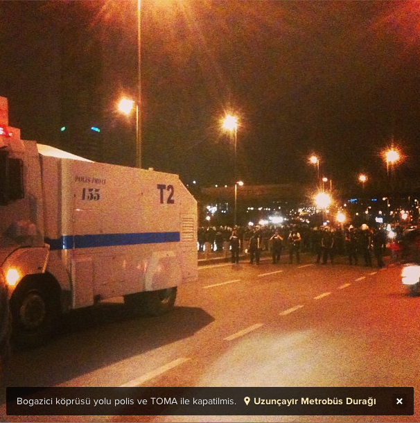 23:33 Boğaziçi Köprüsü yolu polis ve TOMA ile kapatıldı.