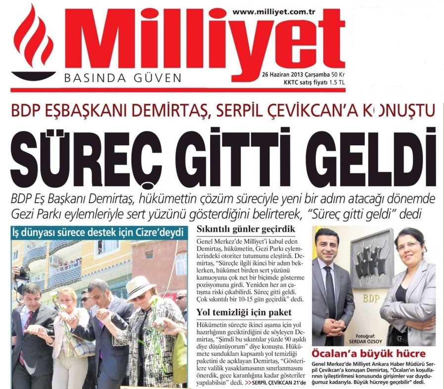 Gezi eylemlerinin barış sürecini olumsuz etkilediğini söyleyen BDP Eş Başkanı Selahattin Demirtaş, hükümetin dilinin kaygı verici olduğunu ifade etti. “Barış süreci gitti geldi” diyen Demirtaş, sıkıntıların yüzde 90 çözüldüğünü dile getirdi. Öcalan’ın İmralı’da daha geniş bir hücreye taşınacağını söyleyen Demirtaş, devlete de yedi maddelik bir öneri mektubu yazdığını açıkladı