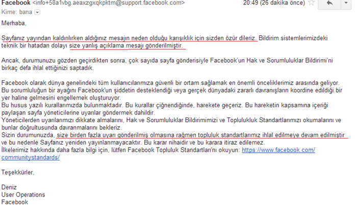 Ötekilerin Postası'nın sayfasına, kapatılmadan önce birden fazla uyarı gönderilmiş olunmasına rağmen sayfanın Facebook'taki topluluk standartlarını ihlal etmeye devam ettiğinin ve bu nedenle nihai olarak iade edilmeyeceğinin söylendiği mail şöyle: