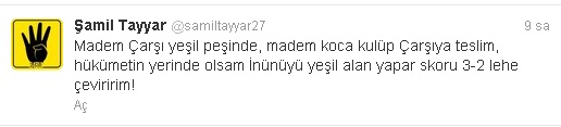 Agos.com.tr - Şamil Tayyar Twitter hesabından yaptığı açıklamada, “Madem Çarşı yeşil peşinde, madem koca kulüp Çarşı’ya teslim, hükümetin yerinde olsam İnönü’yü yeşil alan yapar skoru 3-2 lehe çeviririm!” ifadesini kullandı.