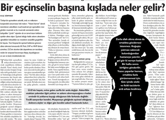 Ulaş Gürpınar imzasıyla yer verilen yazı, bir haber olmayıp adı saklı eşcinsel Ü.G’nin askerlik başvurusundan terhisine yaşadığı tikel deneyimlere ilişkin bir görüşmeden ibarettir. Gazetenin muhabir kadrosu tarafından hazırlanmış ve haber olarak tasarlanmış değil, dışarıdan katkı olarak sunulmuş bir tanıklık kaydıdır. Dolayısıyla Ü.G.’nin görüşme boyunca ifade ettiği bütün sıkıntıları, bir haber merkezi refleksiyle teyit etmek böyle bir formatta mümkün ya da beklenebilir bir şey değildir.