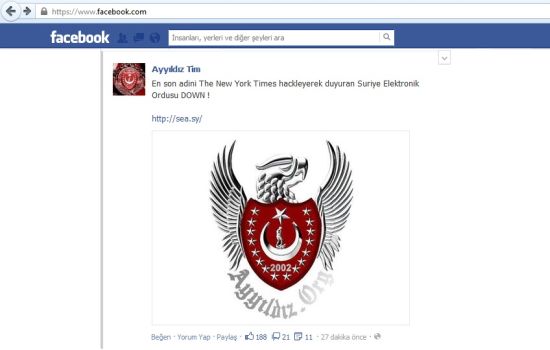 New York Times’ın (NYT) internet sitesini dün gece çökerten ve kendilerine ‘The Syrian Electronic Army’ (Suriye Elektronik Ordusu) adını veren hacker grubunun internet sitesi, Türk hackerlar Ayyıldız Tim tarafından hacklendi.