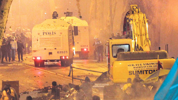 Bir eylemcinin sosyal paylaşım sitesinde yüklediği görüntülerde bir iş makinası ‘Akrep’ adı verilen polis aracını bölgeden uzaklaştırırken görülüyor.