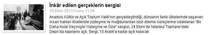 Dünyanın farklı ülkelerinde yaşanan insan hakları ihlalleriyle yüzleşme ve mağdurlardan özür dileme süreçlerine odaklanan ‘Bir Daha Asla! Geçmişle Yüzleşme ve Özür’ sergisi, Tophane’deki Depo’da kapılarını açtı. Türkiye’ye de geçmişle yüzleşme çağrısı yapan Agos, bu hafta, Hrant Dink’in ‘Ali topu bir kez de Agop’a atsa’ sözüne atıfta bulunarak ‘Ali topu Agop’tan özür dile’ manşetiyle çıktı.