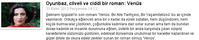 Şebnem İşigüzel’in son romanı ‘Venüs’, eğlenceli olduğu kadar yürek sızlatan, düşündüren, küçük bulmacalar çözdüren, çoğunlukla kadınlara dair sırlar sunan ve tam da bundan dolayı kadınlık ve insanlık durumuna eğilen, edebiyat dünyamıza unutulmaz bir karakter kazandıran bir roman olmuş. Bürkem Cevher yazdı.