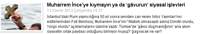 Agos.com.tr - CHP Grup Başkanvekili Muharrem İnce, Agos’un haberi üzerine Twitter’dan yaptığı açıklamada, Türkiye vatandaşı olan değil, bu toprakları işgale gelen ‘Yorgo’ları ve ‘Dimitri’leri kastettiğini açıkladı.