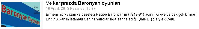 Türkiye’de son yıllarda İstanbul Şehir Tiyatroları’nda sahnelenen Şark Dişçisi’yle tanınan Hagop Baronyan’ın iki oyunu bgst Yayınları tarafından Baronyan Oyunları başlığıyla yayımlandı. Kitabın başında, Baronyan üzerine bugüne kadarki en kapsamlı çalışmayı yapmış olan Kevork Bardakjian'ın önsözü de bulunuyor. Murat Cankara yazdı.