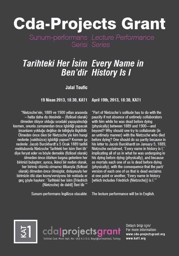 - Tarihteki Her İsim Ben’dir, Jalal Toufic, 19 Nisan 2013, CDA-Projects Sunum-performans serisi, Kat 1