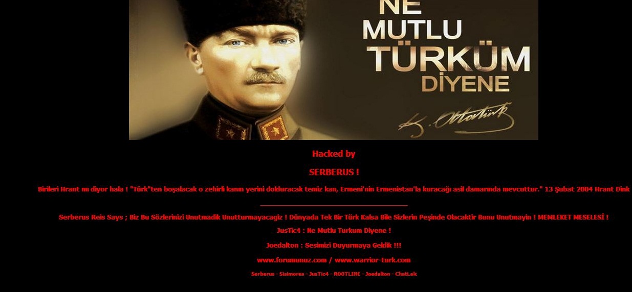 Sitemizin ana sayfasına Mustafa Kemal Atatürk fotoğrafı ile birlikte, “Hacked by SERBERUS! Birileri Hrant mı diyor hâlâ! Türk’ten boşalacak o zehirli kanın yerini dolduracak temiz kan, Ermeni’nin Ermenistan’la kuracağı asil damarında mevcuttur. 13 Şubat 2004 Hrant Dink