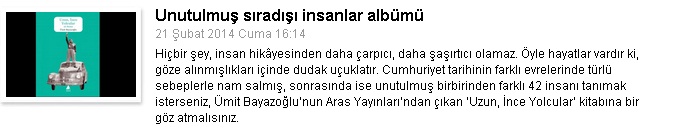 Bu sayıya araştırmacı, yazar Ümit Bayazoğlu’nun sıradışı portrelerinin yer aldığı ‘Uzun, İnce Yolcular’ ile başlıyoruz. Cumhuriyet tarihinin farklı evrelerinde türlü sebeplerle nam salmış, sonrasında ise unutulmuş birbirinden farklı 42 insanı tanımak isterseniz, bu kitaba göz atmalısınız. Karin Karakaşlı yazdı.