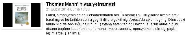 Thomas Mann ölmeden hemen önce yazdığı ‘Doktor Faustus’ta kaçıp gitmek zorunda kaldığı vatanıyla, ulusuyla, pişmanlıklarıyla hesaplaşmış. Dileriz bir gün Türkiye edebiyatında da bu kadar samimi bir hesaplaşmayı, bu kadar ustaca yazılmış bir biçimde okuyabiliriz. Banu Yıldıran Genç yazdı.