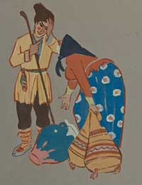 Paregentan ormanda ilerlerken nal seslerini duyunca küpü ve çuvalı bir ağacın ardına saklamış ,kendi de çıkmış yola. Başlamış beklemeye. Atlı telaşla sormuş: