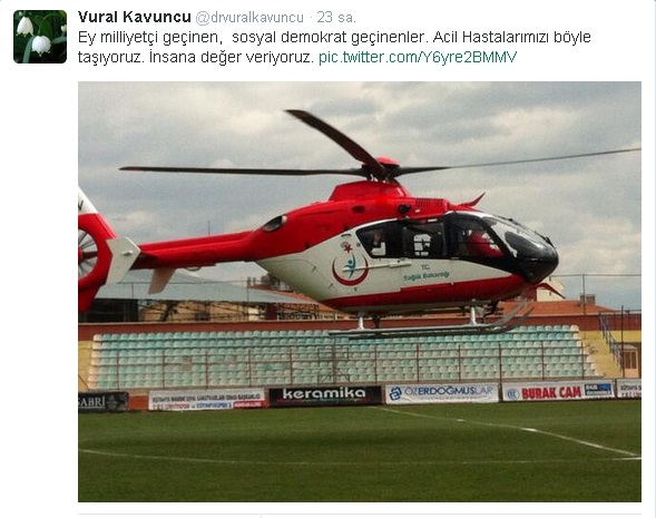 Hürriyet.com.tr’nin haberine göre, Bakan Müezzinoğlu’nun bindiği helikopter havalandıktan sonra fotoğrafını çeken AK Parti Kütahya Milletvekili Prof. Dr. Vural Kavuncu, Twitter hesabından paylaştığı fotoğrafa, “Ey milliyetçi geçinen, sosyal demokrat geçinenler. Acil Hastalarımızı böyle taşıyoruz. İnsana değer veriyoruz” ifadelerine yer verdi.