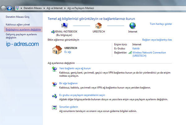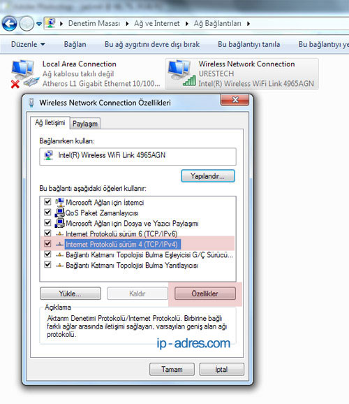 Ekranda bilgisayara bağlı olan ağ bağlantıları görüntülenecektir. Listeden kullandığınız ağ bağdaştırıcınıza sağ tıklayın ve önümüze açılan menüden “özellikler” i seçin. Wireless kullanılan bir bilgisayarda “Wireless Network Connetion” yazanı sağ tıklıyoruz.