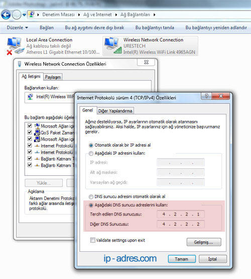 Ardından ekrana gelen pencerede “Aşağıdaki DNS Sunucu adreslerini kullan” seçeneğini seçip, tercih edilen ve diğer DNS sunucu alanlarına sırasıyla “4.2.2.1″ ve “4.2.2.2″ yazıyoruz ve tamam diyerek pencereleri kapatın. İstediğiniz siteye girebilirsiniz artık.