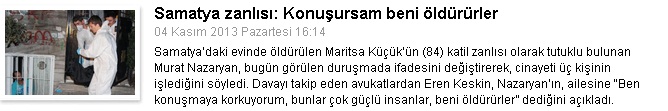 Samatya’da 85 yaşındaki Maritsa Küçük’ü canavarca hisle ve eziyet çektirerek öldürdüğü iddiasıyla ağırlaştırılmış müebbet hapis istemiyle yargılanan Murat Nazaryan hakkında düzenlenen raporda, akıl sağlığının yerinde olduğu belirtildi. Savcının sorusu üzerine olay günü ile ilgili bilgi veren Nazaryan, “Arabanın içinde bana hap içirdiler. Hapı içtikten sonra kendimi kaybettim” dedi.