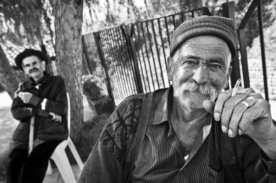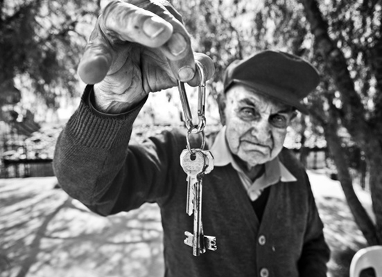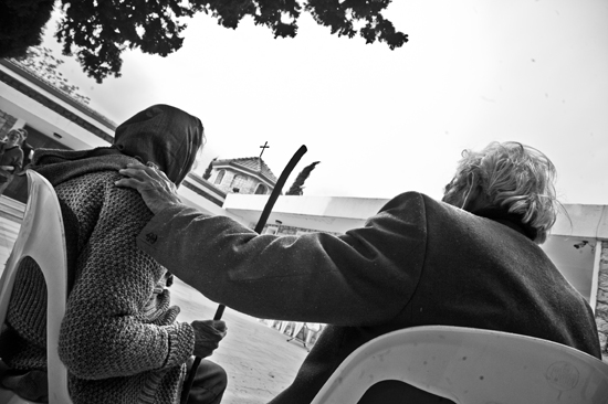Beni ayağa kalkarak karşılayan hüzünlü beyefendi Marc Chagall’ın tablolarındaki ince uzun yüzlü, derin bakışlı erkekleri anımsatıyor. Movses Arabian ve kızkardeşi Marta Arabian, kışı Lazkiye’de yazı Kesab’da geçiren ve birlikte yaşayan iki kardeş. Sürgün yolunda kaybolan Marta Arabian’ın ilaçlarına muadil aranıyor. Başı döndüğü için elinde bir baston var sürekli. Bir ağaç dalını anımsatan o bastonu için “Kesab’dan getirdim. Yaslanıyorum ki burada düşmeyeyim” diyor. Dünyanın en güzel ifadelerinden birinin sahibi Movses Arabian ise “Ermenistan ve ABD’de akrabalarımız var. Beni bu saç sakalla görmelerini istemem” diyerek sadece arkadan fotoğraflanmayı kabul ediyor. İki kardeş de durumlarının ne olacağı belli olana kadar protesto olarak en eski kıyafetleri ile durmaya karar vermişler.