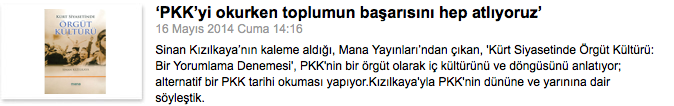 Sinan Kızılkaya’nın kitabı, 'Kürt Siyasetinde Örgüt Kültürü: Bir Yorumlama Denemesi', PKK'nin bir örgüt olarak iç kültürünü ve döngüsünü anlatıyor; alternatif bir PKK tarihi okuması yapıyor. Kızılkaya, Özgün Çağlar ile yaptığı söyleşide, “Türk tarafının 'barış' anlayışıyla, Kürt tarafının 'barış' anlayışının bir olmadığını biliyoruz, fakat Türk tarafı, Erdoğan'ın 'bu işi bitirebileceğine' dair bir güven içinde” diyor.