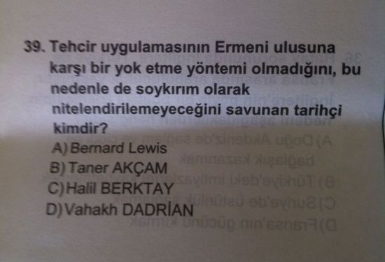 ‘Ermenilerin Batılı devletlerle işbirliği içinde olduğu’ ezberine sıklıkla vurgu yapan sorulardan en dikkat çekicilerinden birisi ise, ‘Tehcir uygulamasının Ermeni ulusuna karşı bir yok etme yöntemi olmadığını, bu nedenle de soykırım olarak nitelendirilemeyeceğini savunan tarihçi kimdir?’ sorusu. Şıklar arasında doğru cevap olan Bernard Lewis’in yanı sıra Taner Akçam, Halil Berktay ve ismi Vahakh olarak yazılan Vahakn Dadrian’da yer aldı.