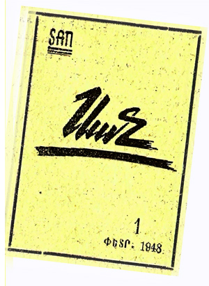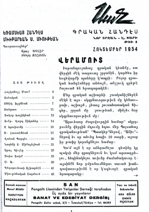 Ara Güler ve Onnik Fıçıcıyan tarafından yayına hazırlanan 1954 yılındaki ‘San’ dergisinin ilk sayısında, Zahrad, Zareh Hrahuni (Arto Cümbüşyan), Dr. Vart Şigaher gibi yazarlar dikkat çekiyor. |
