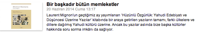 Laurent Mignon'un ‘Hüzünlü Özgürlük: Yahudi Edebiyatı ve Düşüncesi Üzerine Yazılar’ başlıklı kitabında yer alan yazıların tamamı, farklı ülkelere ve dillere dağılmış Yahudi kültürü üzerine. Bu yazılar bize farklı kültürler hakkında soru sorma imkânı da sağlıyor. Murat Cankara yazdı.