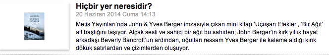 Baba oğul, John ve Yves Berger imzasıyla çıkan ‘Uçuşan Etekler’, alçak sesli ve sahici bir ağıt niteliği taşıyor. John Berger’in kırk yıllık hayat arkadaşı Beverly Bancroft’un ardından oğulları ressam Yves Berger ile kaleme aldığı kırık dökük satırlardan ve çizimlerden oluşan kitap, henüz vakit varken geleceğe bakabilecek bizler için küçük bir hatırlatma niteliği taşıyor. Evrim Kaya yazdı.