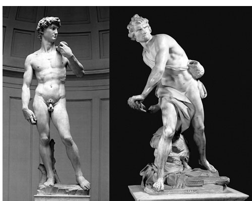 Solda, Michelangelo’nun Rönesans döneminde yaptığı ‘straight’ Davut. Sağdaysa, Bernini’nin eylem halindeki ‘kuir’, Barok Davut’u. |