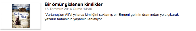 Temmuz sayımıza Vartanuş’un Ali’si ile başlıyoruz. Kitap, yıllarca kimliğini saklamış bir Ermeni gelinin dramından yola çıkarak yazar Aysel Kılıç Karslı’nın babasının yaşamını anlatıyor. 2015'e bir yıl kala yıllardır saklanan, sır kabul edilen trajik hikâyeler, daha çok karşımıza çıkmaya başladı. Vartanuş’un Ali’si de bunun örneklerinden birisi. Banu Yıldıran Genç yazdı.