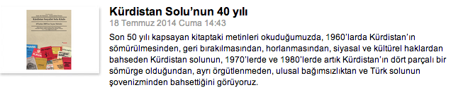 Emir Ali Türkmen ve Abdürrahim Özmen’in yayına hazırladığı ‘Kürdistan Sosyalist Solu Kitabı’ geç de olsa önemli bir boşluğu dolduruyor. Kitapta son 50 yılda ortaya çıkan örgütlerin ve Musa Anter, Sait Kırmızıtoprak, İsmail Beşikçi ve Abdullah Öcalan gibi bu örgütler üzerinde çok etkili olmuş kişilerin metinlerine yer veriliyor. Barış Ünlü yazdı.