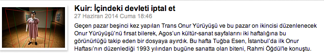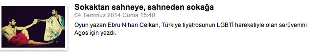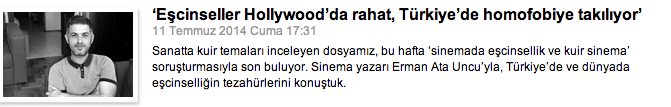 Türkiye’de, tüm dünyada olduğu gibi, LGBTİ bireylerin ve kuir temaların sanata ve edebiyata yansımalarının tarihi elbette sanatın ve edebiyatın tarihi ile yaşıt. Ancak son yıllarda LGBTİ bireylerin mücadelelerinin görünürlüğünün artmasına paralel olarak sanat ve edebiyat üretiminde de giderek artan bir varlıktan söz etmek mümkün. Geçen pazar beşinci kez yapılan Trans Onur Yürüyüşü ve bu pazar on ikincisi düzenlenecek Onur Yürüyüşü’nü fırsat bilerek, Agos’un kültür-sanat sayfalarını üç haftalığına bu görünürlüğü takip eden bir dosyaya ayırdık. İlk hafta Tuğba Esen, İstanbul’da ilk Onur Haftası’nın düzenlediği 1993 yılından bugüne sanatta olan biteni, Rahmi Öğdül ve Fatih Özgüven’le konuşarak derledi. Fırat Demir de Ahmet Haşim’den günümüze “eşcinsel edebiyatçının başındaki haleyi” anlattı. Sonraki hafta, Ermenistanlı feminist aktvisit Karine Aghajanyan, hem LGBT bireylerin sesi olan hem de Ermenistan sanatının tekdüzeliğini kıran kuir ve eşcinsel sanatçıların muhafazakar topluma karşı yükselttikleri mücadeleyi, oyun yazarı ve yönetmen Ebru Nihal Celkan ise Türkiye tiyatrolarında esen kuir rüzgârı anlattı. Üçüncü hafta Erman Ata Uncu ile dünya ve Türkiye sinemasında kuir imgelerin evrimini ve eşcinsel sinemanın köşe taşlarını konuştuk.