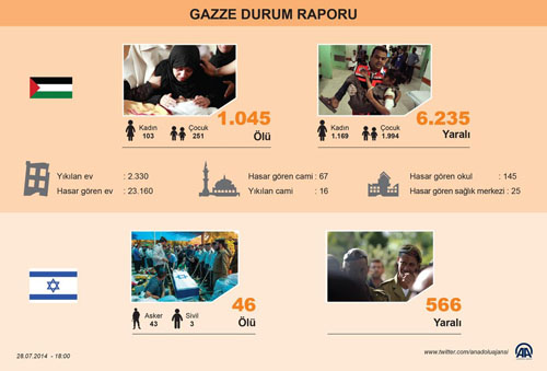 Gazze'de görevini fiilen sürdüren eski Filistin hükümeti Sağlık Bakanlığı Sözcüsü Eşref el-Kudra 7 Temmuz'dan bu yana hayatını kaybeden Filistinli sayısının bin 119'a, yaralıların ise 6 bin 550'ye yükseldiğini belirtti