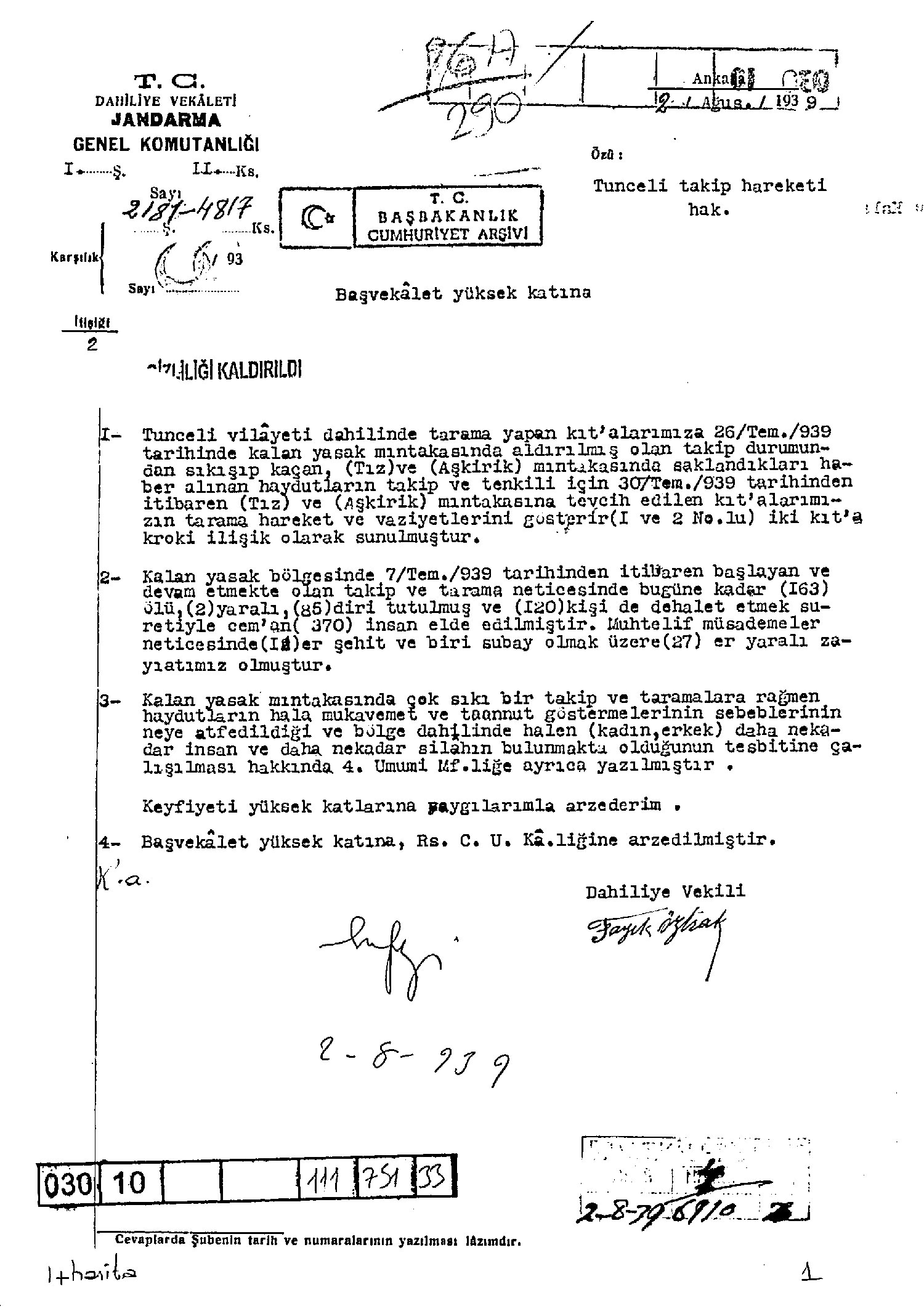 Yazıda şöyle deniyor: “Kalan (Tunceli’nin eski adı) yasak bölgesinde 7/Tem./1939 tarihinden itibaren başlayan ve devam etmekte olan takip ve tarama neticesinde bugüne kadar (163) ölü, (2) yaralı, (85) diri tutulmuş ve (120) kişi de dehalet etmek suretiyle cem’an (370) insan elde edilmiştir. Muhtelif müsademeler neticesinde (1) er şehit ve biri subay olmak üzere (27) er yaralı zayiatımız olmuştur. Kalan yasak mıntıkasında çok sıkı takip ve taramalara rağmen haydutları hâlâ mukavemet ve taannut göstermelerinin sebeplerinin neye atfedildiği ve bölge dâhilinde halen (kadın, erkek) daha ne kadar insan ve daha ne kadar silahın bulunmakta olduğunun tespitine...”
