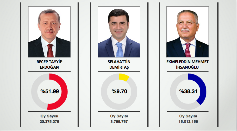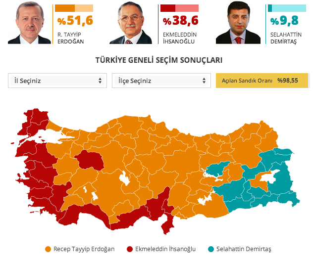 AA'nın son verilerine göre göre 59 ilde Erdoğan, 13 ilde İhsanoğlu, 9 ilde Demirtaş önde.