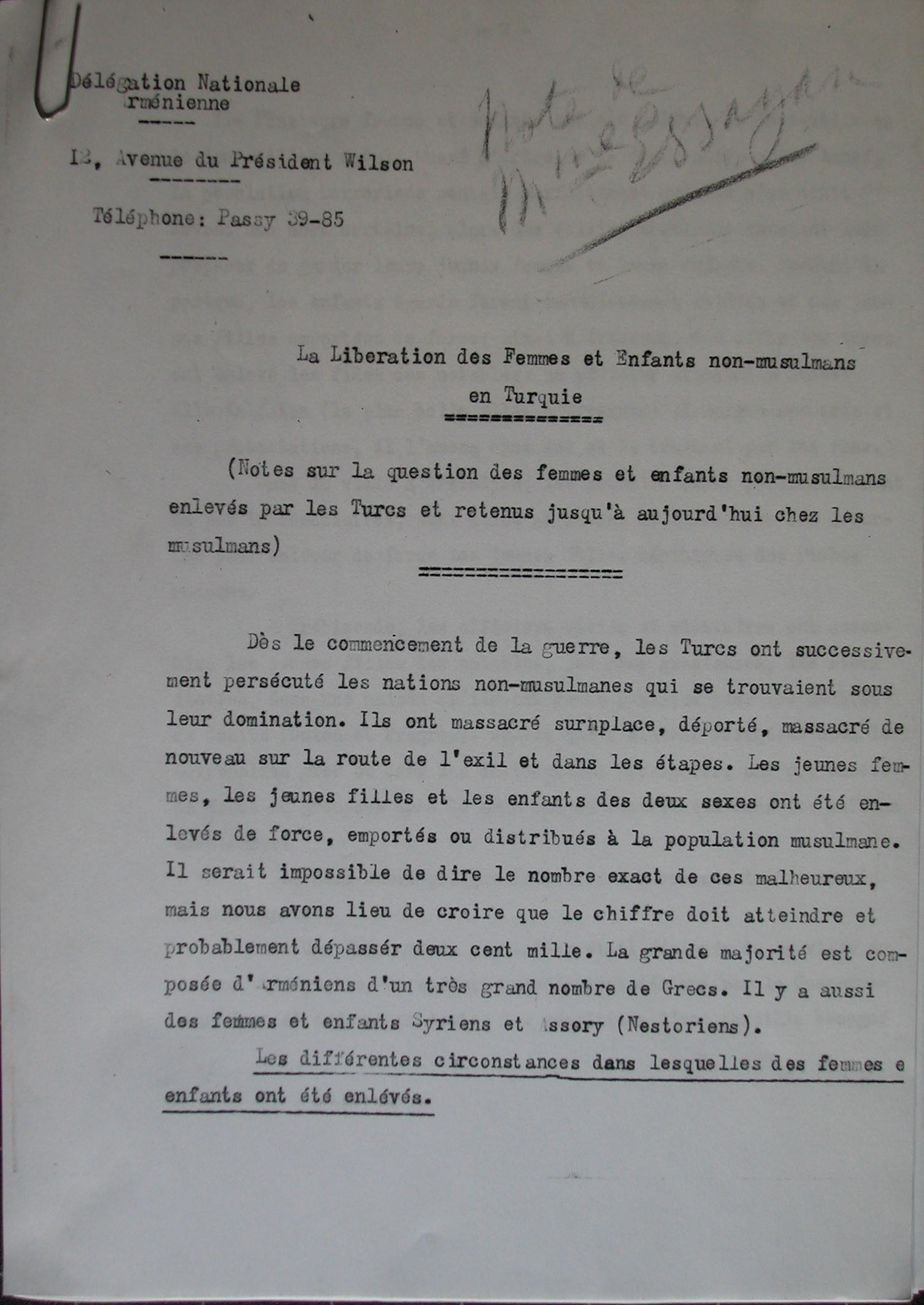 Այստեղ կ՚ուզենք այդ տեղեկագրին նիւթ դարձած դէպքերը պատմող եւ ցարդ չհրատարակուած փաստաթուղթի մը մասին խօսիլ։ Փարիզի «Նուպարեան» գրադարանէ ներս կատարած մեր ուսումնասիրութիւններու ընթացքին հանդիպեցանք 8 Մարտ 1919 թուակիր փաստաթուղթին, որ գրի առնուած էր հայազգի կարեւորագոյն կին գրողներէն Զապէլ Եսայեանի կողմէ եւ ներկայացուած էր Փարիզի Հայոց Ազգային պատուիրակութեան նախագահ Պօղոս Նուպար Փաշային։