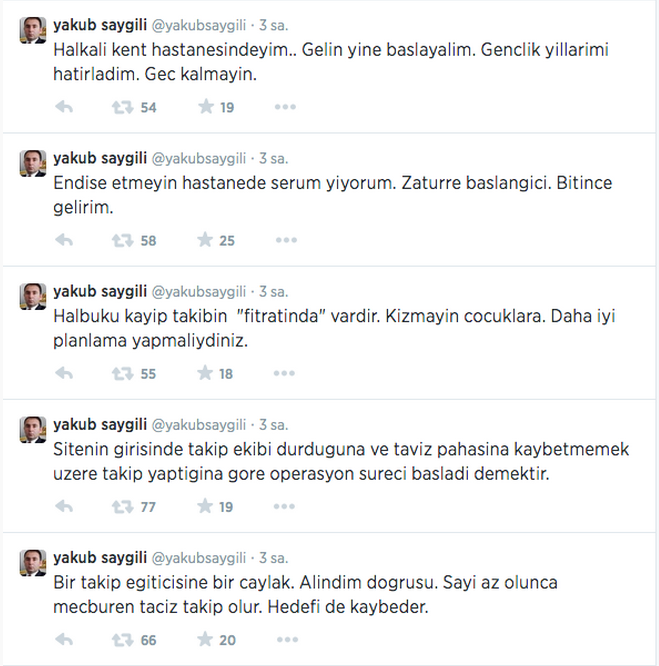 Yakup Saygılı gece saat 03.00 sularında kişisel Twitter hesabından paylaştığı mesajlarda gözaltına alınacağını ve kendisini takip eden polislerli atlatarak hastaneye gittiğini yaszmıştı. Saygılı daha sonra kendisine zatürre için serum bağlandığını belirtmiş ve yattığı hastanenin adını vermişti.