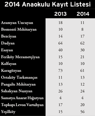 Yeni bir okul yılının başlamasıyla birlikte Ermeni okullarını da kayıt heyecanı sardı. Ana okulları ise öğrencinin ilk kazanıldığı yer olarak apayrı bir öneme sahip. Bu yıl devlet desteğinden yararlanacak olan Ermeni okulları, çevrelerinde giderek çoğalan özel okullarla da rekabet içinde. Ermeni kimliğinin yaşatılması adına hayati öneme sahip olan okullara velilerin ilgisi giderek artıyor. Bu yıl pek çok anaokulu kontenjanlarını doldurmuş durumda.