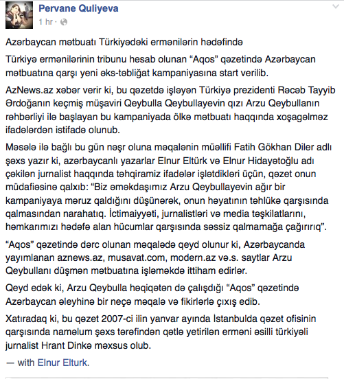 RSF Türkiye temsilcisi Erol Önderoğlu da, “Azeri medyasının barışçıl bir gelecek için onca şey dururken, Agos’a çalışıyor diye, aslında ülkenin zenginliği sayılabilecek bir durum nedeniyle genç bir muhabiri hedef tahtasına koymasına anlam vermek zor” açıklamasını yaptı ve medyanın ülkelerarası gerginlikleri besleyici tarzda yayıncılık yapmasının gazeteciliğin zararına olduğuna işaret etti; “Ülkeler arası gerginlikler biz gazetecileri, mantıksız ve hoşgörüsüz bir yola sürüklememeli” diye ekledi.