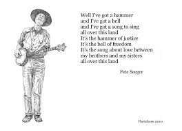Pete Seeger Woody Guthrie’nin arkadaşı, yoldaşıydı. Onun artık tüm Amerikalılarca benimsenen, sanki siyahların haklarını bayraklaştırmak için yazılmışa benzeyen This land is my land (Bu ülke benim ülkem) şarkısını, çoğu söylenişte gözardı edilen son dizelerini,