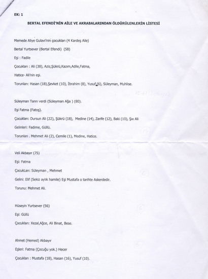Fotokopisini ekte gördüğünüz bu belgeyi bana veren Kazım Arık dostum, 1938’de katledilen o ailenin reisi Bertal Efendi’nin, o sırada evli olup aile dışında bulunmak sayesinde katliamdan kurtulan kızı Azime’nin (Ezima) oğlu. Yani Bertal Efendi’nin torunu.