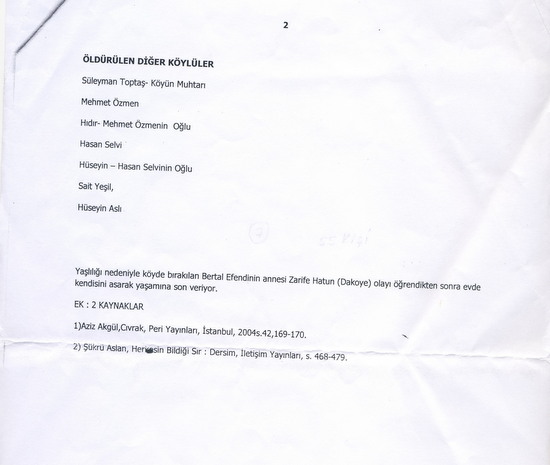 “Elimizde 15.12.1938 tarihli bir mahkeme kararı bulunmaktadır. 14.08.1938 tarihli olayda ana-babası kurşuna dizilerek öldürülen Rane adlı kadının veraset ilamı için mahkemeye yaptığı başvuru üzerine Hozat Asliye Ceza Mahkemesi’nin verdiği bu kararda, insanlarımızın askerî harekât sırasında kurşuna dizilerek öldürülmeleri hakkında, ‘Harakatı [Harekât-ı] Askeriyede imha edilmek suretiyle’ tabiri kullanılmıştır”.
