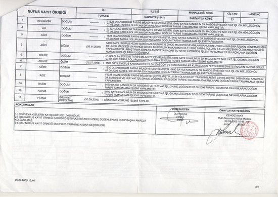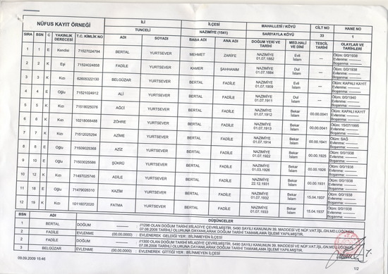 Konumuzdan uzaklaşmayalım. Bugün size Ordu tarafından yine 1938’de yapılan, ama bu sefer 54 + 1 = 55 kişilik başka bir aile katliamının çok daha yeni bir belgesini sunmak istiyorum: 09.09.2009 günü saat 15.46’da Nazımiye Nüfus Müdürlüğü tarafından imzalanıp kırmızıyla mühürlenmiş bir nüfus kayıt örneği.